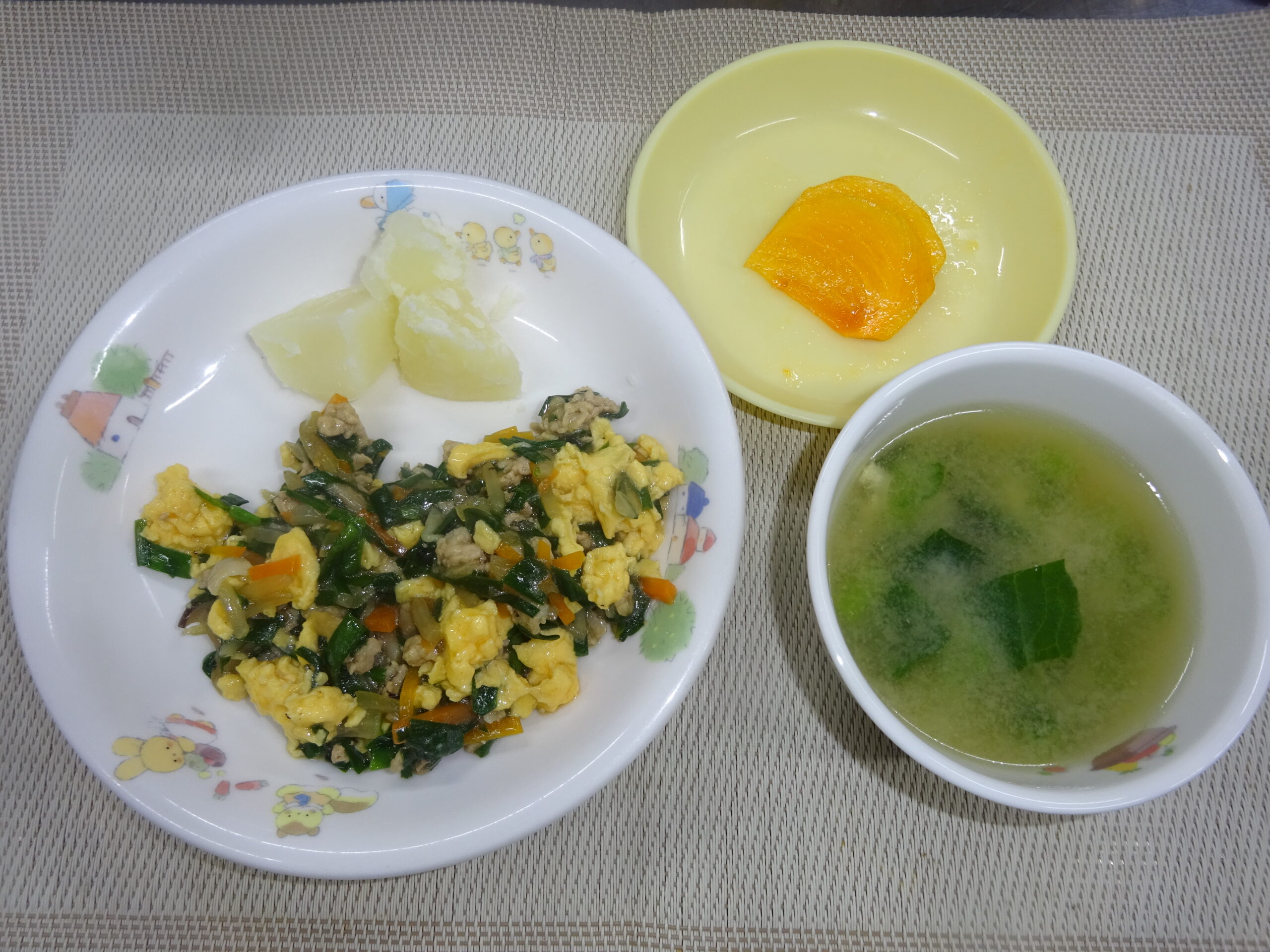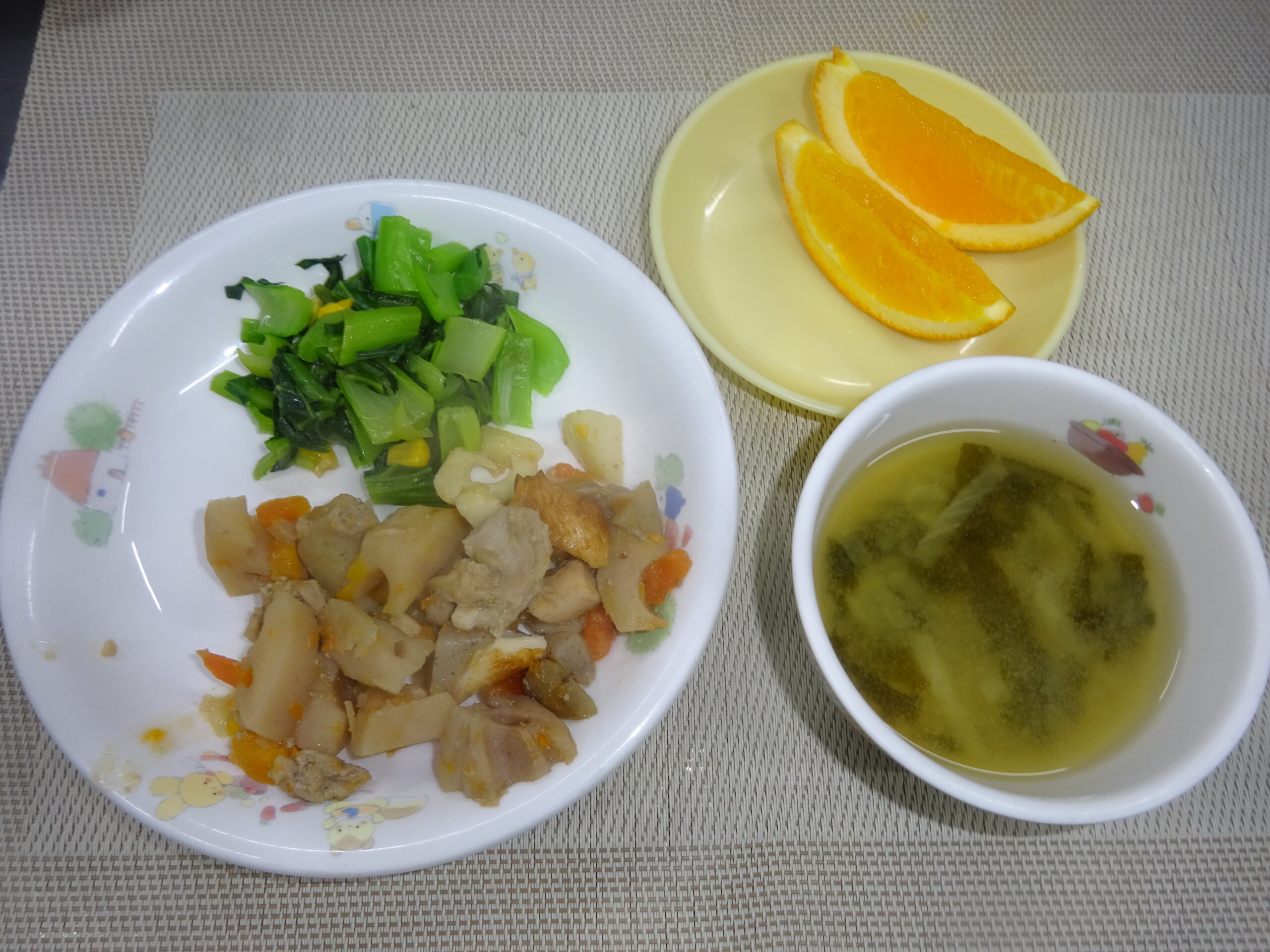 - 炒り鶏風煮 小松菜とコーンのソテー