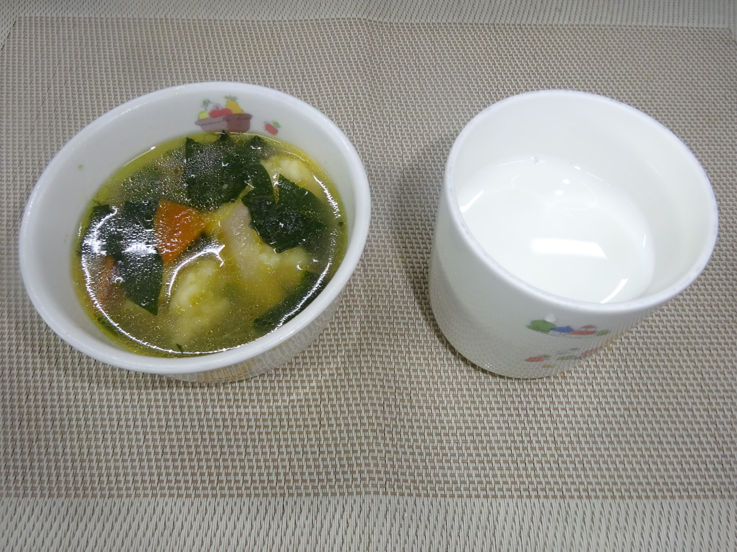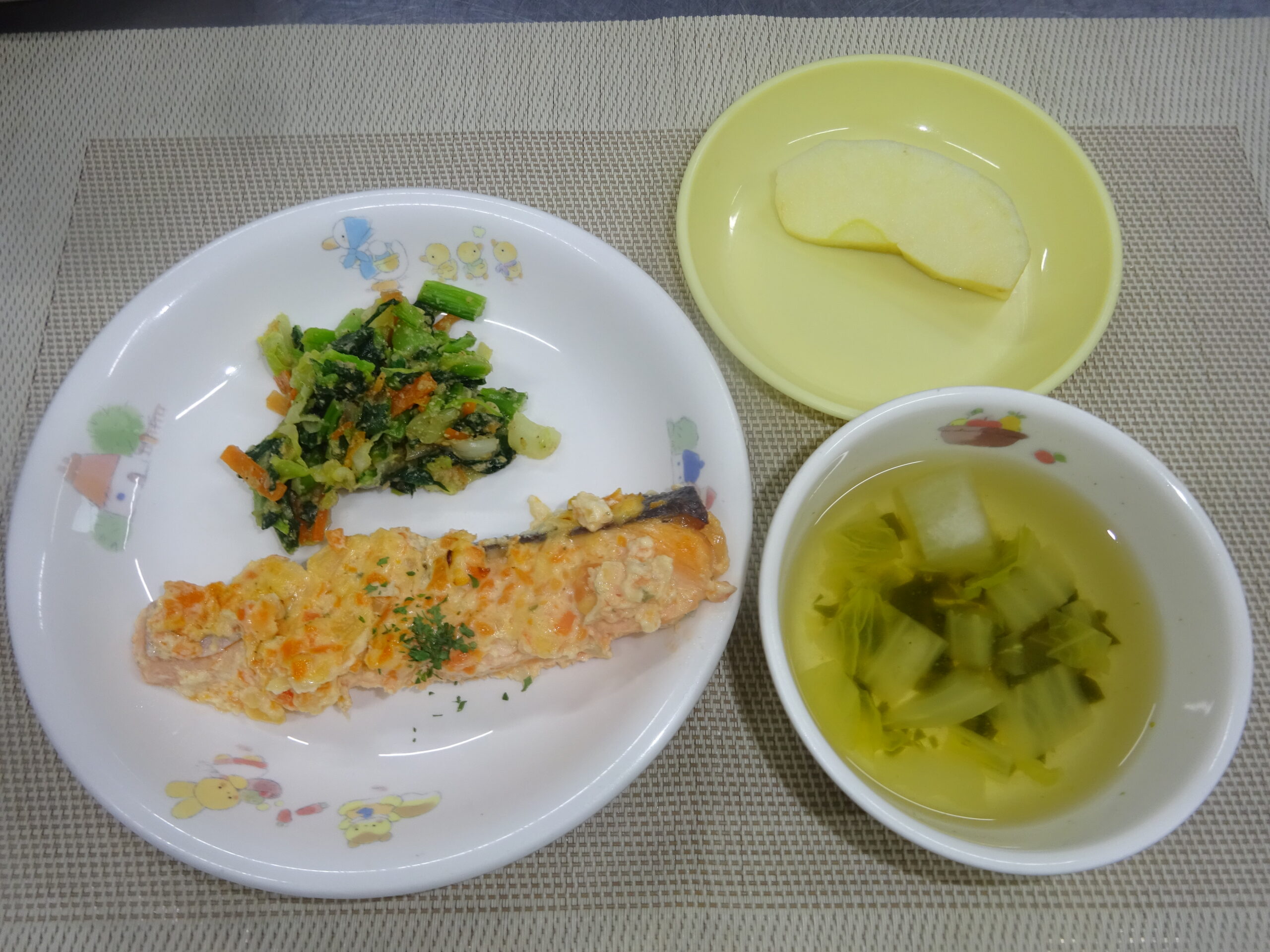 清し汁(白菜、わかめ) りんご