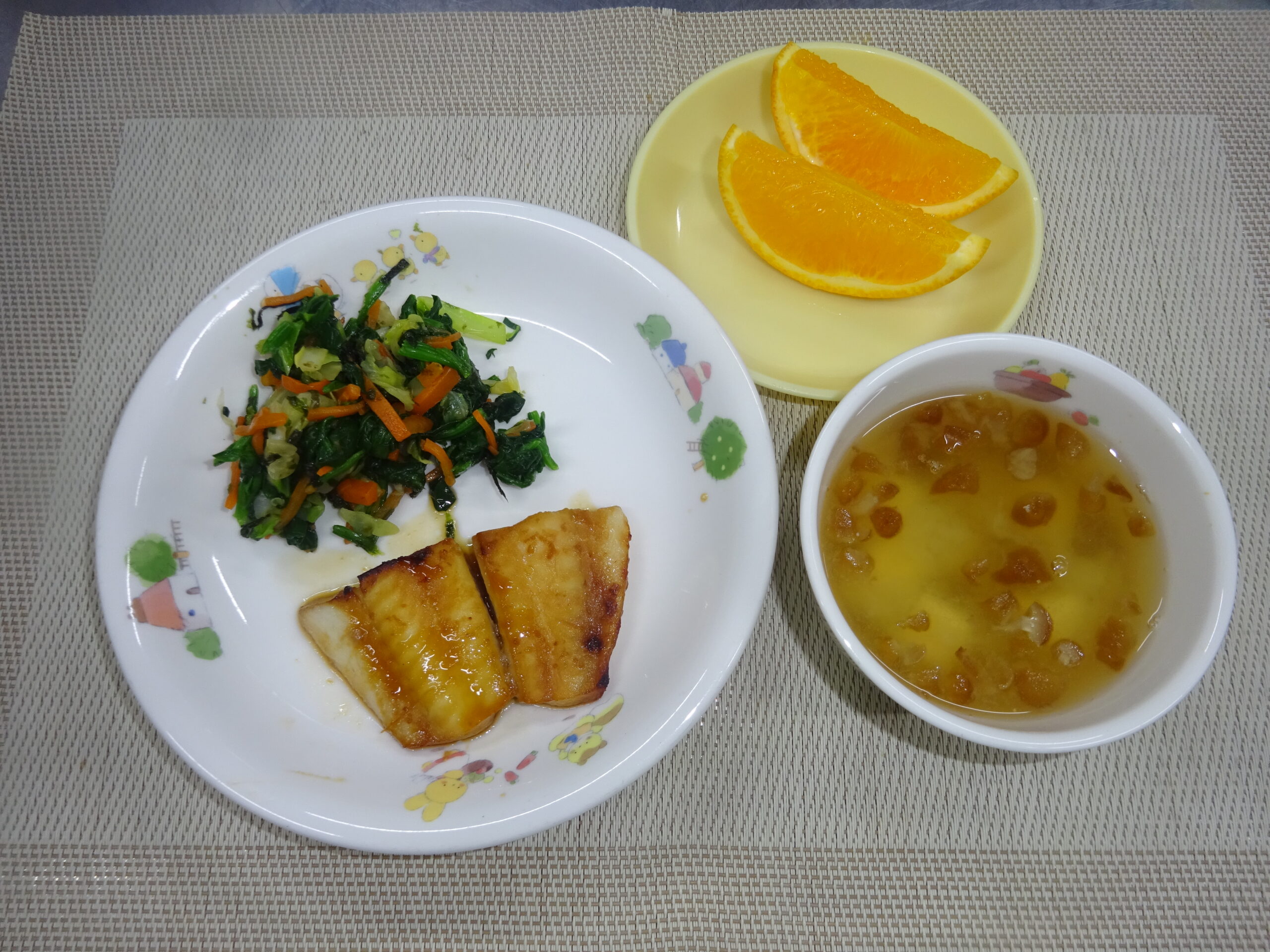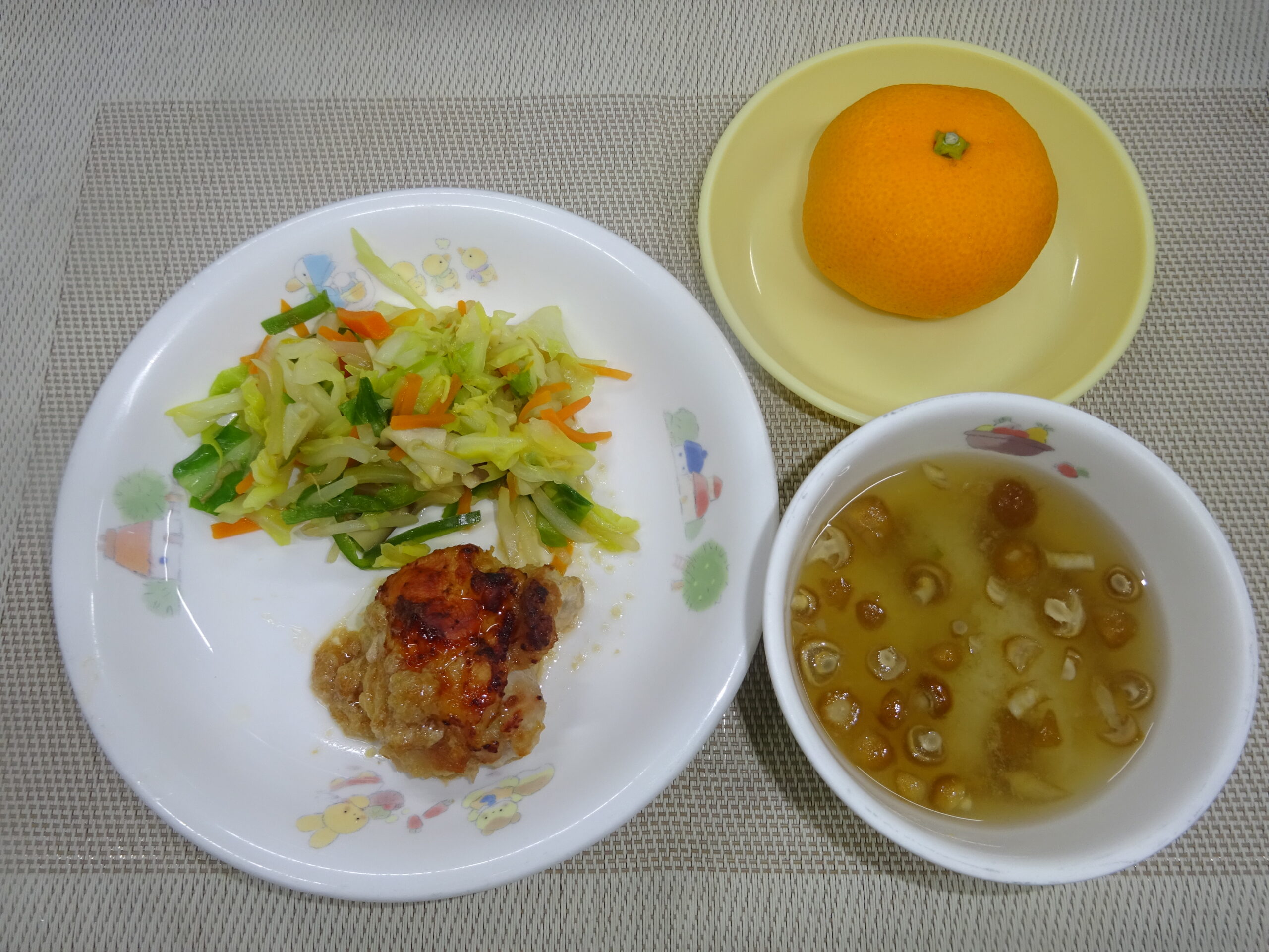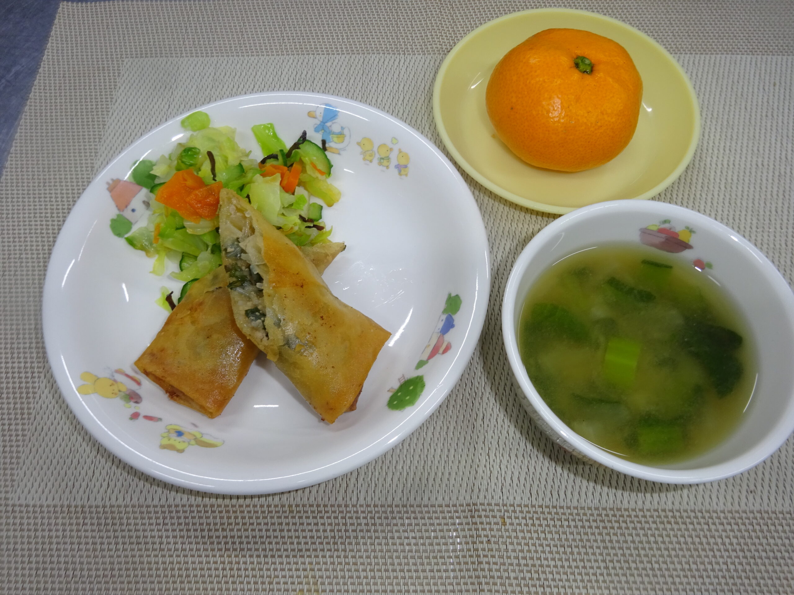 味噌汁(玉葱、小松菜) みかん