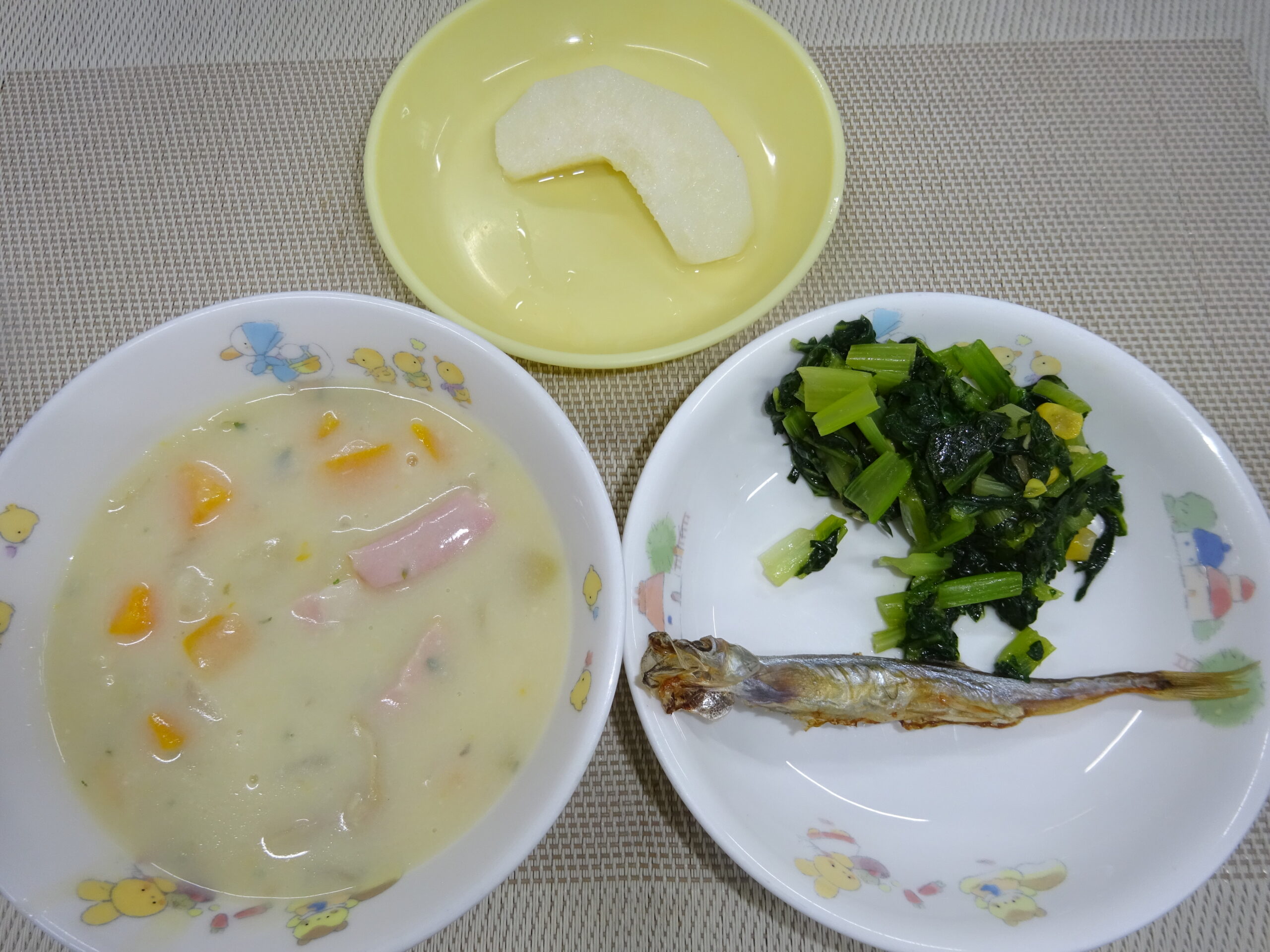 - 豆乳クラムチャウダー 焼き魚(ししゃも)